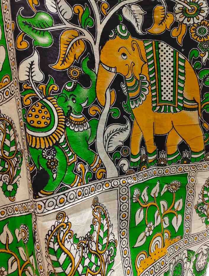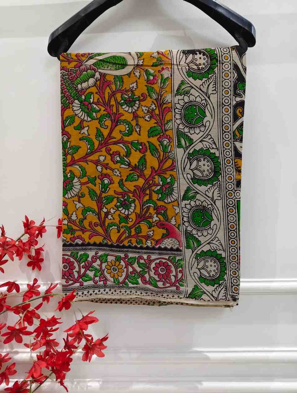 • Kalamkari sarees are sun-dried in open agricultural fields, which may result in minor dust marks — a testament to their authenticity. We recommend washing before first use.