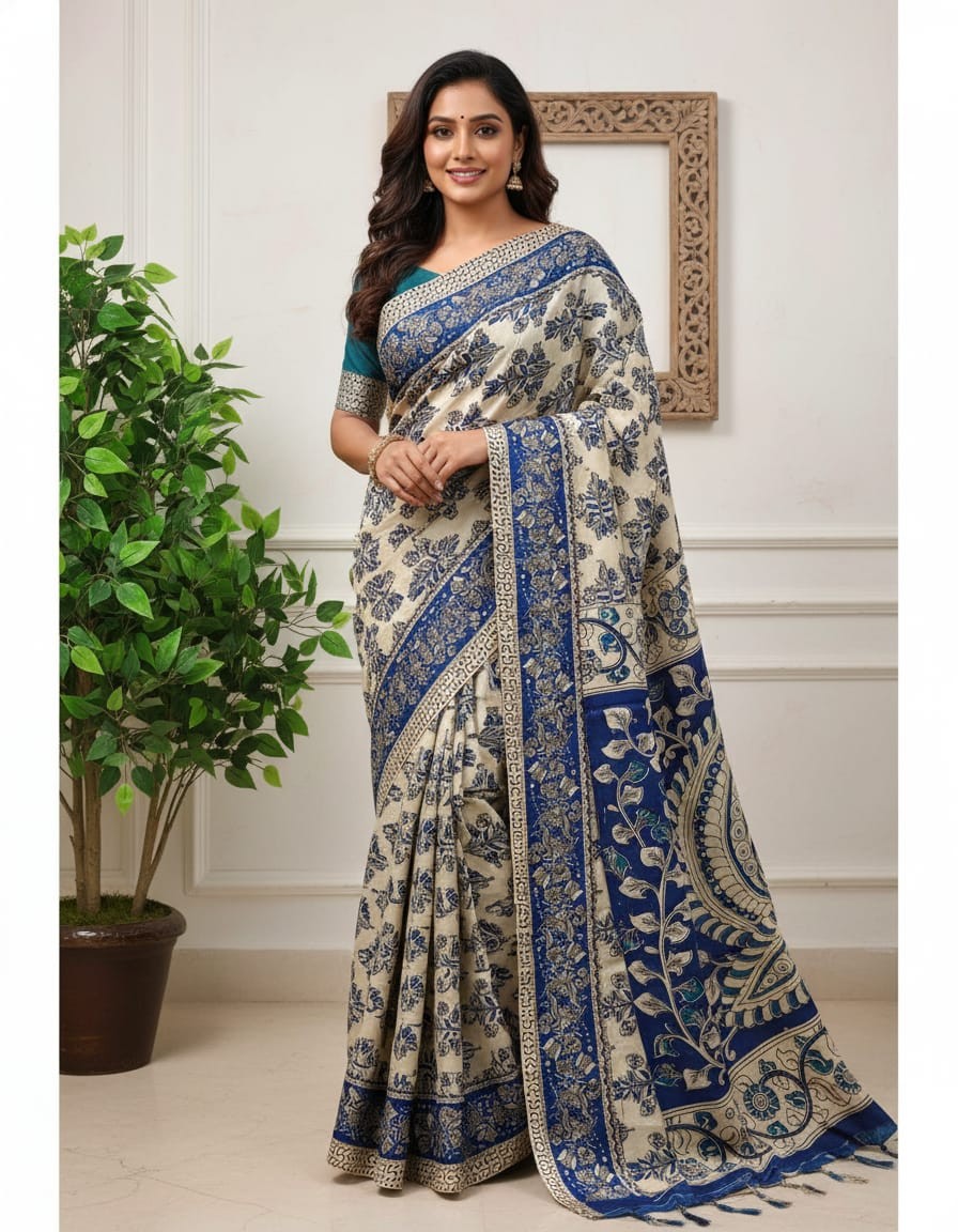 'Parnika' Off White base with Indigo-Blue Floral motifs cotton Kalamkari Saree