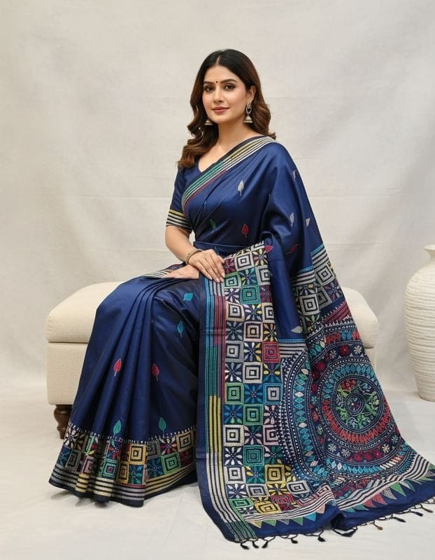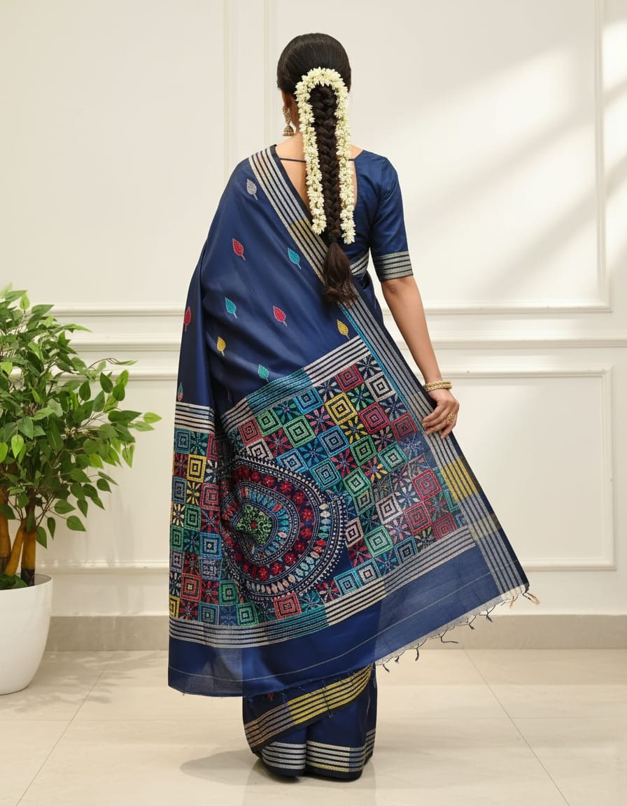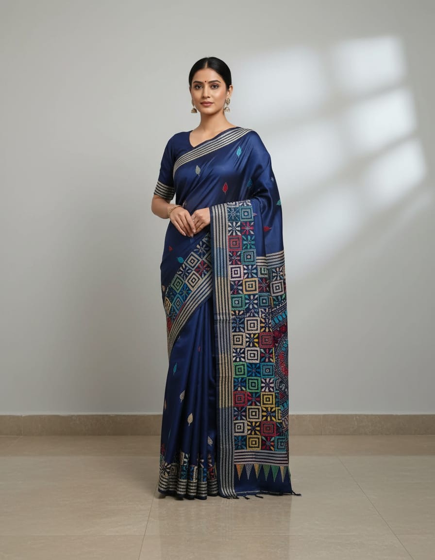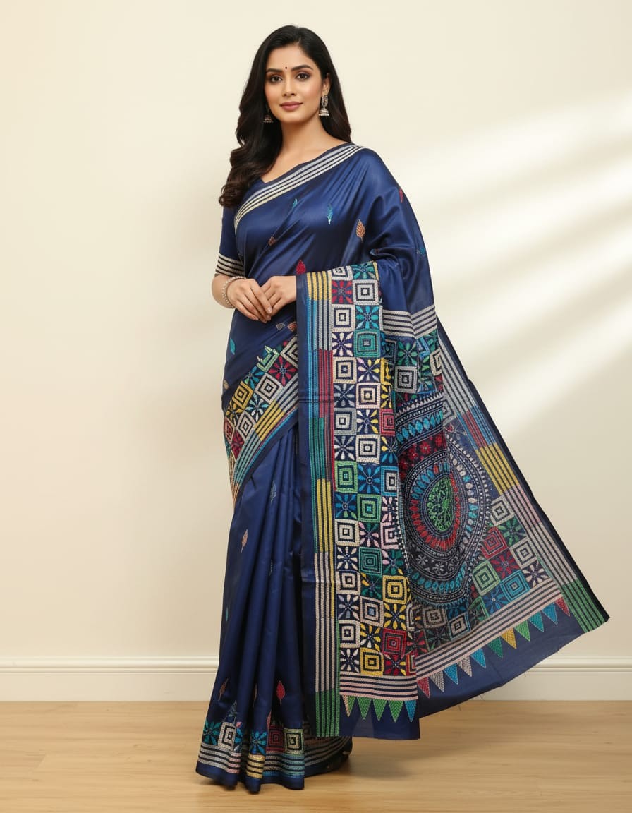 Celebrate timeless craftsmanship with this exquisite Kantha saree, a traditional form of folk embroidery from West Bengal, India. Each saree is a piece of wearable art, hand-stitched using a running stitch technique that has been passed down for generations.