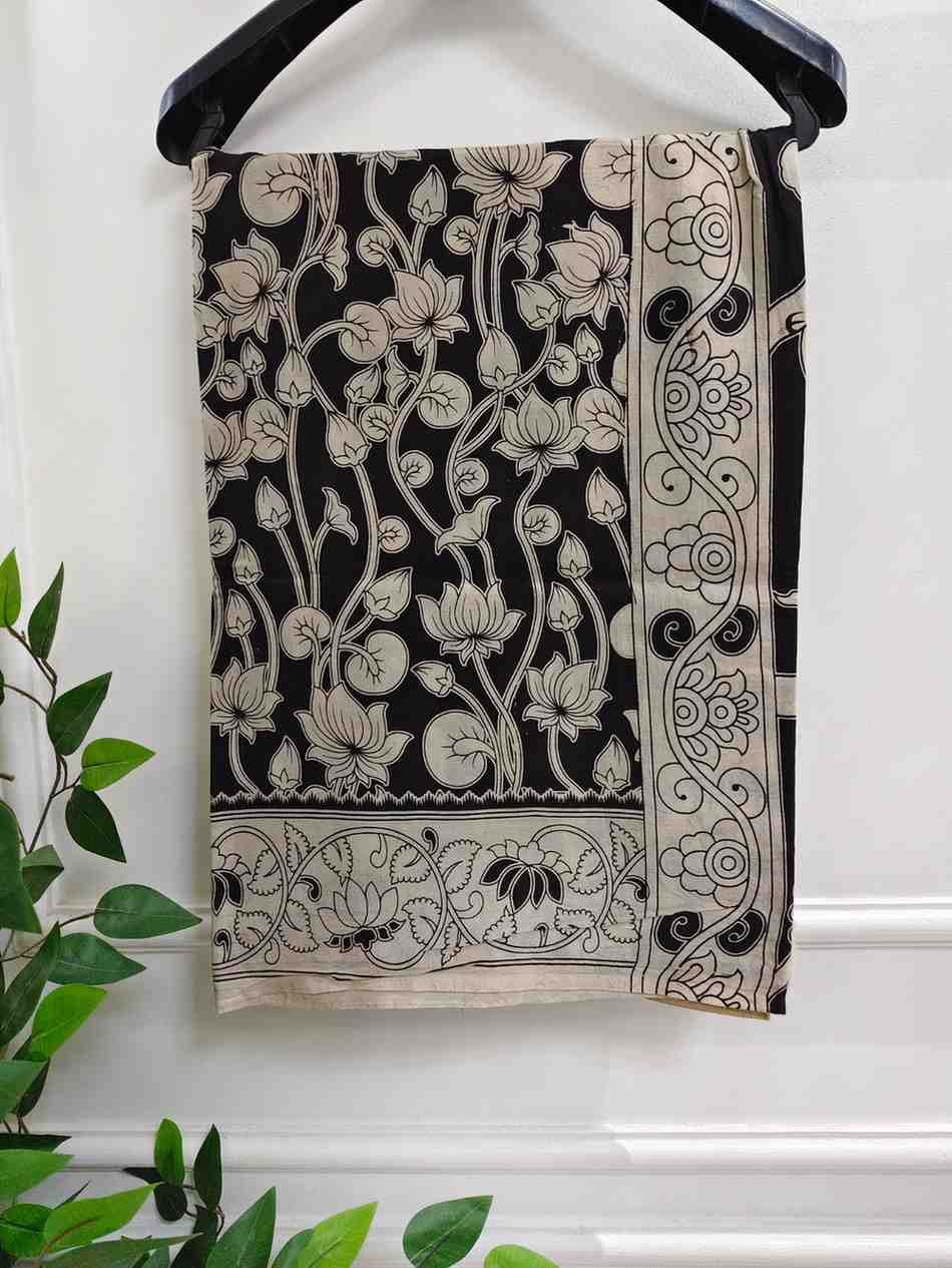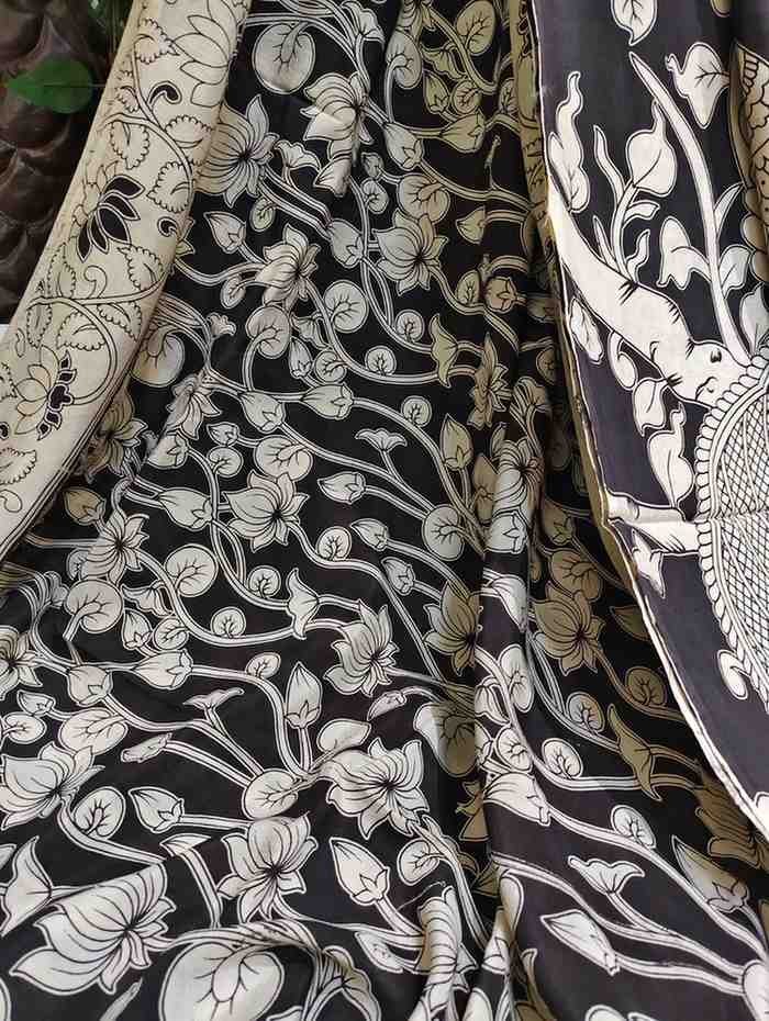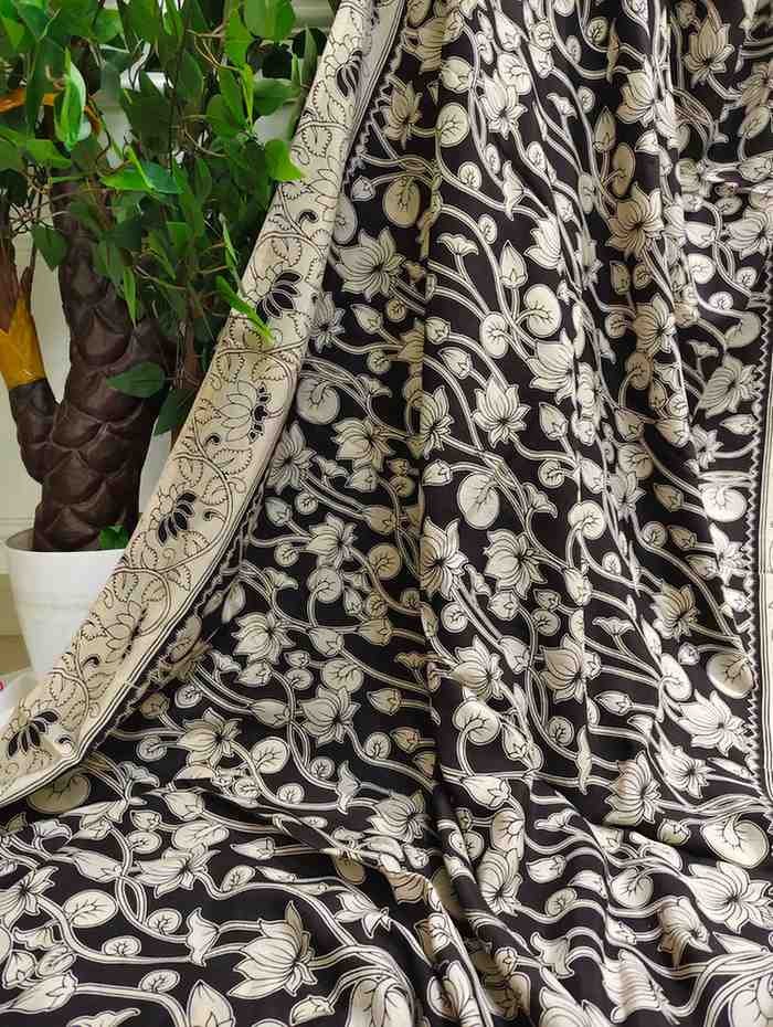 Kalamkari sarees are sun-dried in open agricultural fields, which may result in minor dust marks — a testament to their authenticity. We recommend washing before first use.