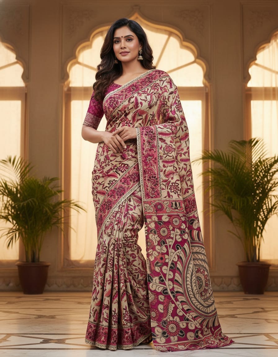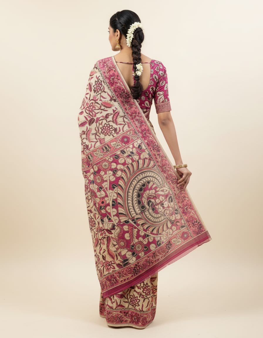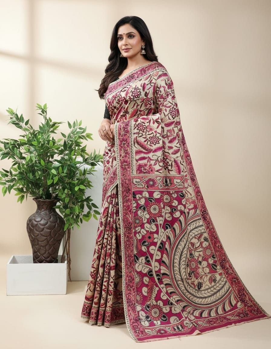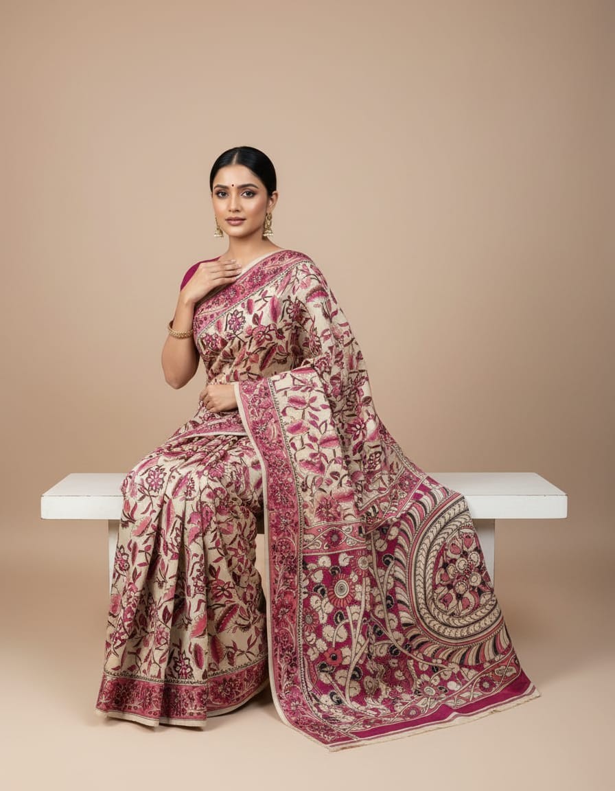 • Kalamkari sarees are sun-dried in open agricultural fields, which may result in minor dust marks — a testament to their authenticity. We recommend washing before first use.