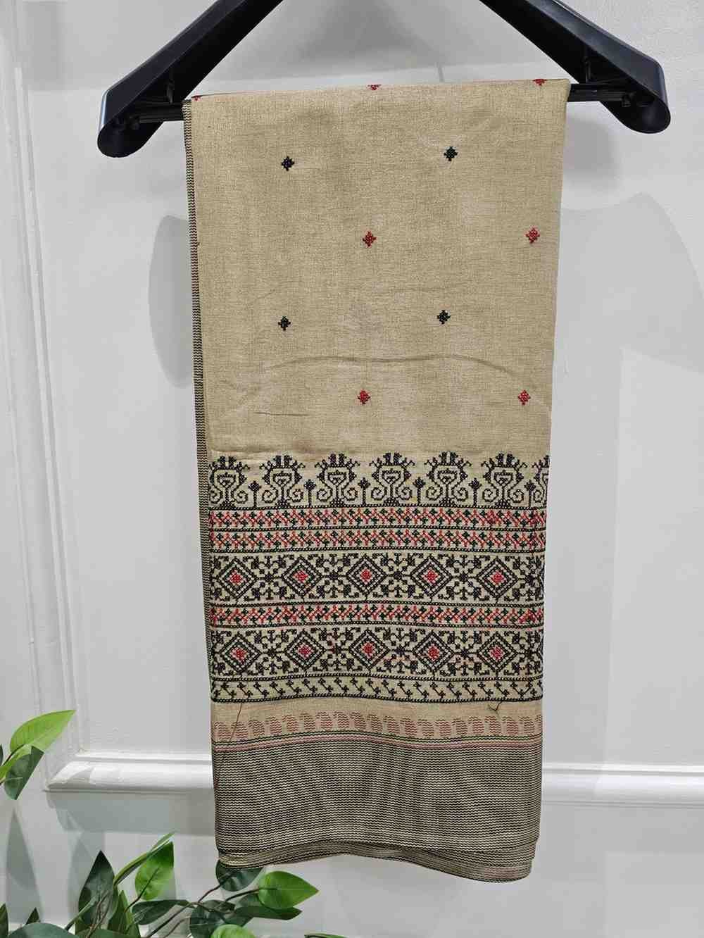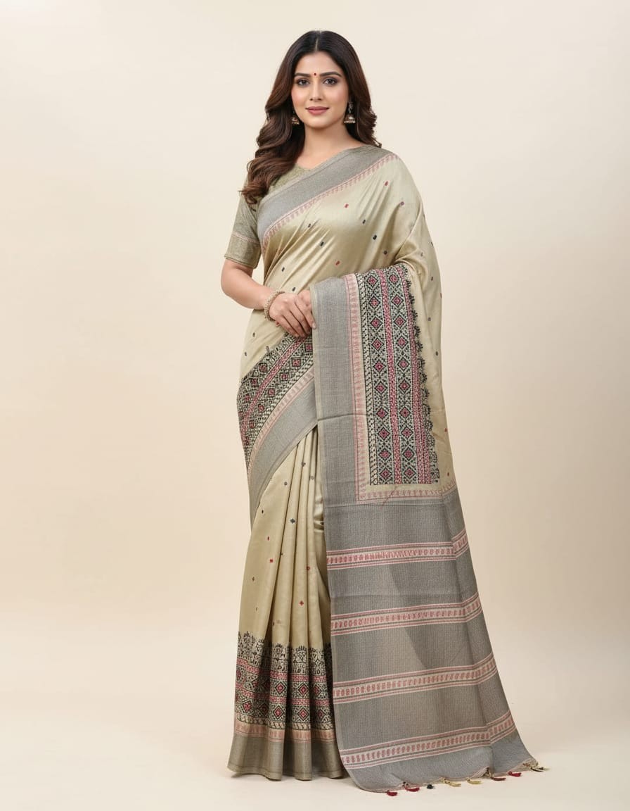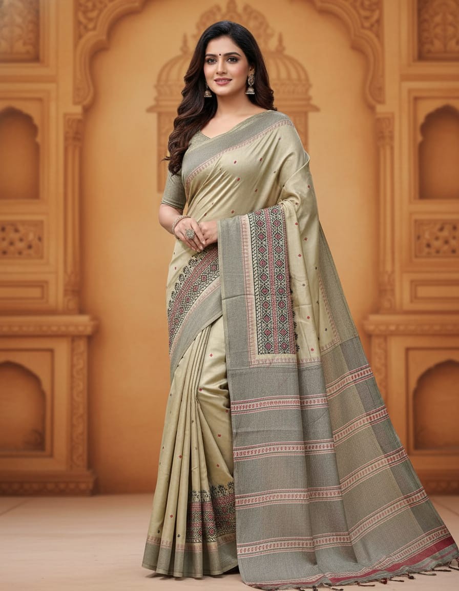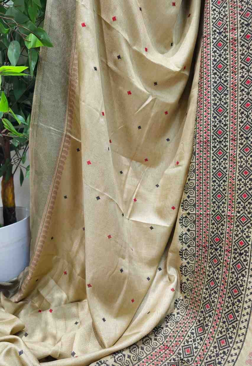 Step into a world of elegance and artistry with our Riona Special Hand Stitched Assam Silk Saree featuring a striking Black Thread Border. Crafted from the finest Assam silk, this saree exudes a natural golden sheen and luxurious texture. The hand-stitched black thread border adds a contemporary touch to the traditional fabric, creating a beautiful contrast that enhances the saree’s timeless appeal. Ideal for weddings, cultural gatherings, or evening events, this saree’s classic design ensures that you stand out with grace and sophistication, while celebrating the rich heritage of Assam.