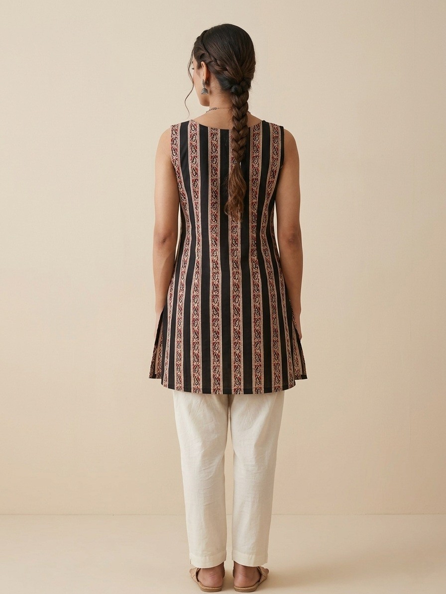 Pattern: The garment features a vertical striped pattern. The stripes alternate between solid black panels and intricate Ajrakh-inspired geometric motifs in earthy tones of maroon, beige, and cream.