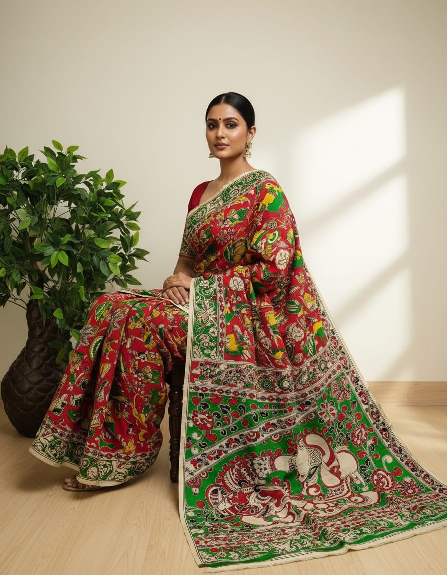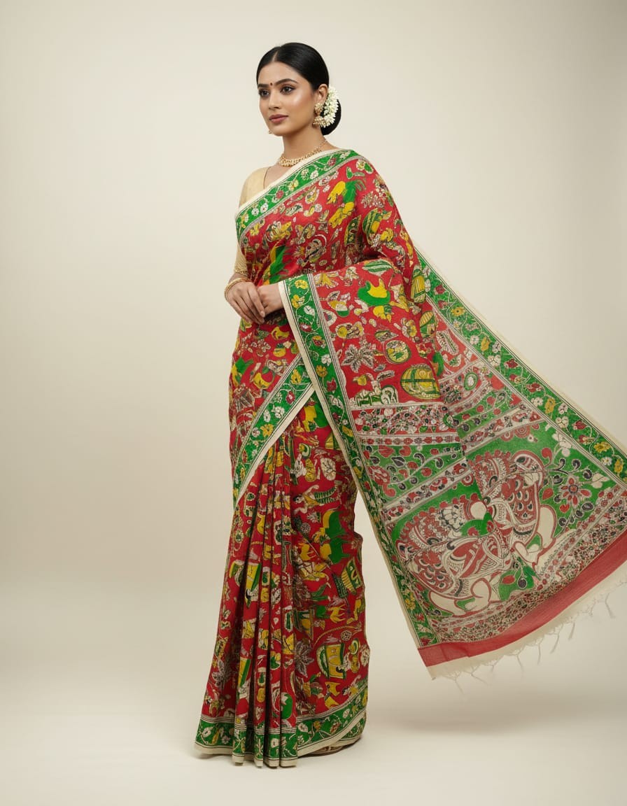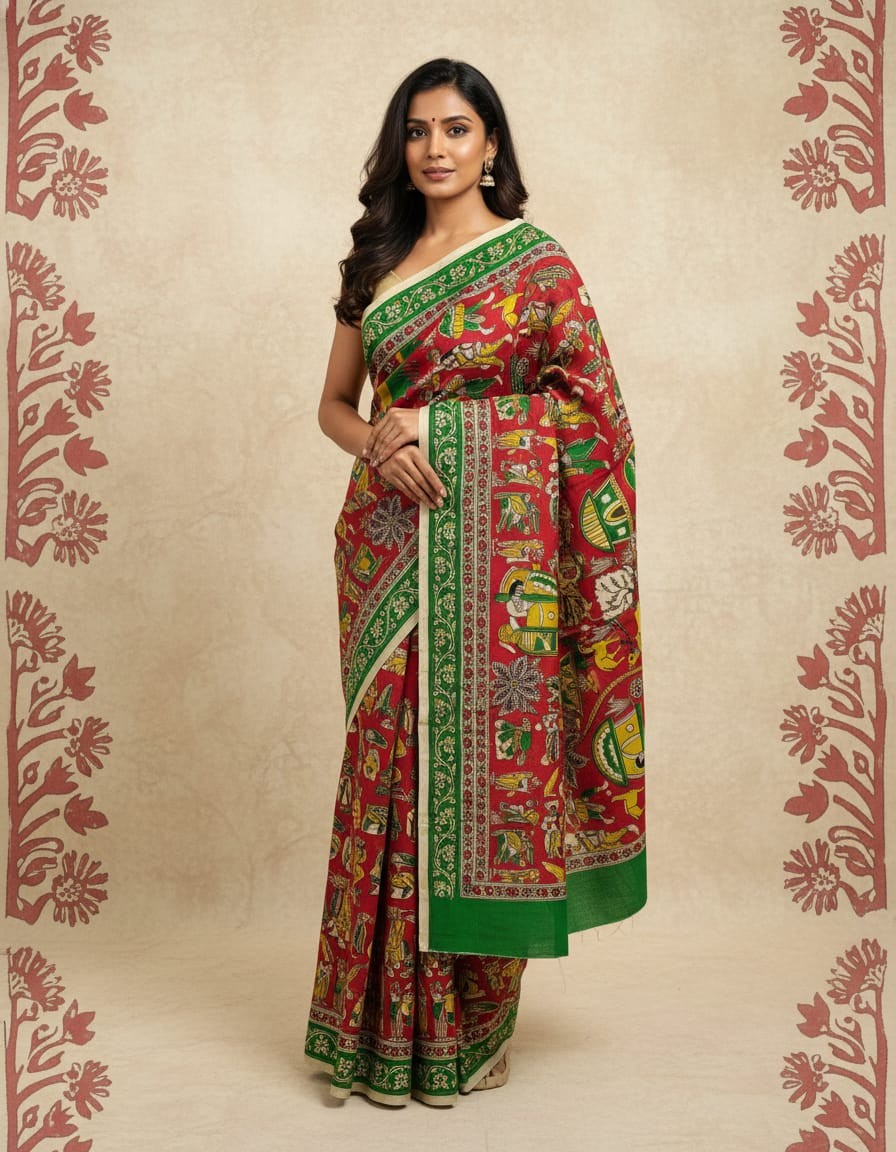 'Samudaya' Red canvas with Rural life design cotton Kalamkari Saree