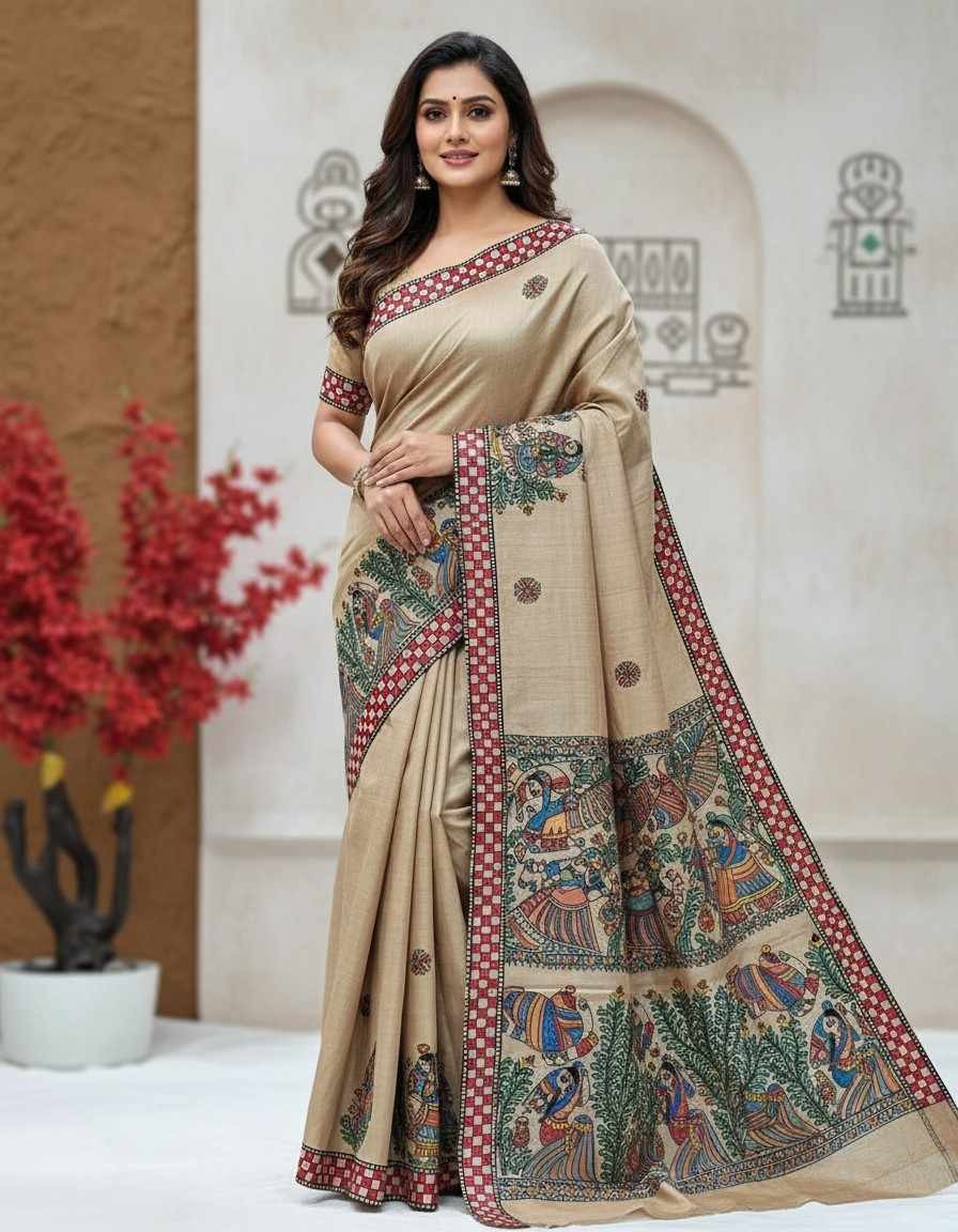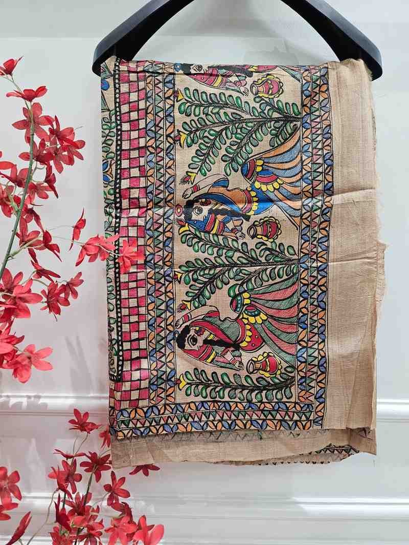Invoke wisdom and grace with the 'SARASWATI' Hand painted Madhubani Pure Tussar Silk Saree. This exquisite saree is a tribute to Goddess Saraswati, the symbol of knowledge, art, and culture. The saree features intricate Madhubani hand-painted motifs that depict divine symbols associated with Saraswati, such as the veena, swan, and lotus, all rendered with meticulous craftsmanship. The luxurious pure tussar silk fabric adds an ethereal glow, making this saree a perfect choice for spiritual events, cultural gatherings, or occasions that celebrate intellect and creativity.