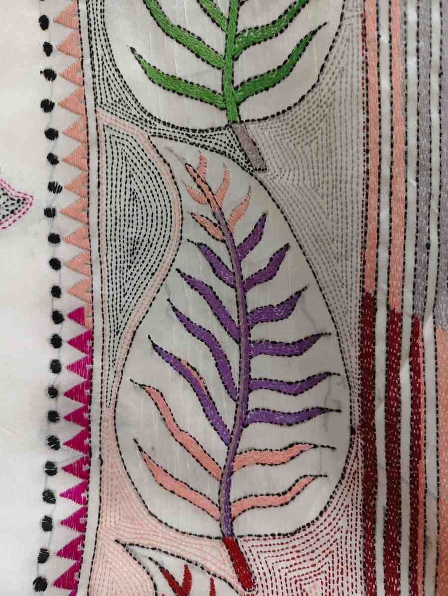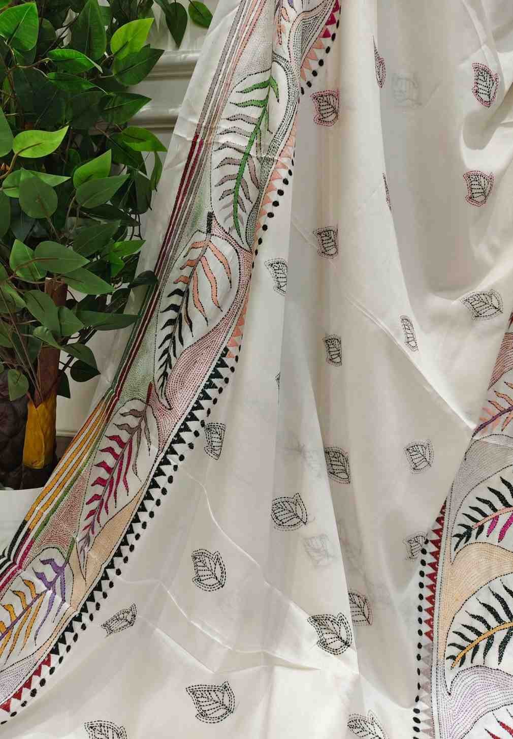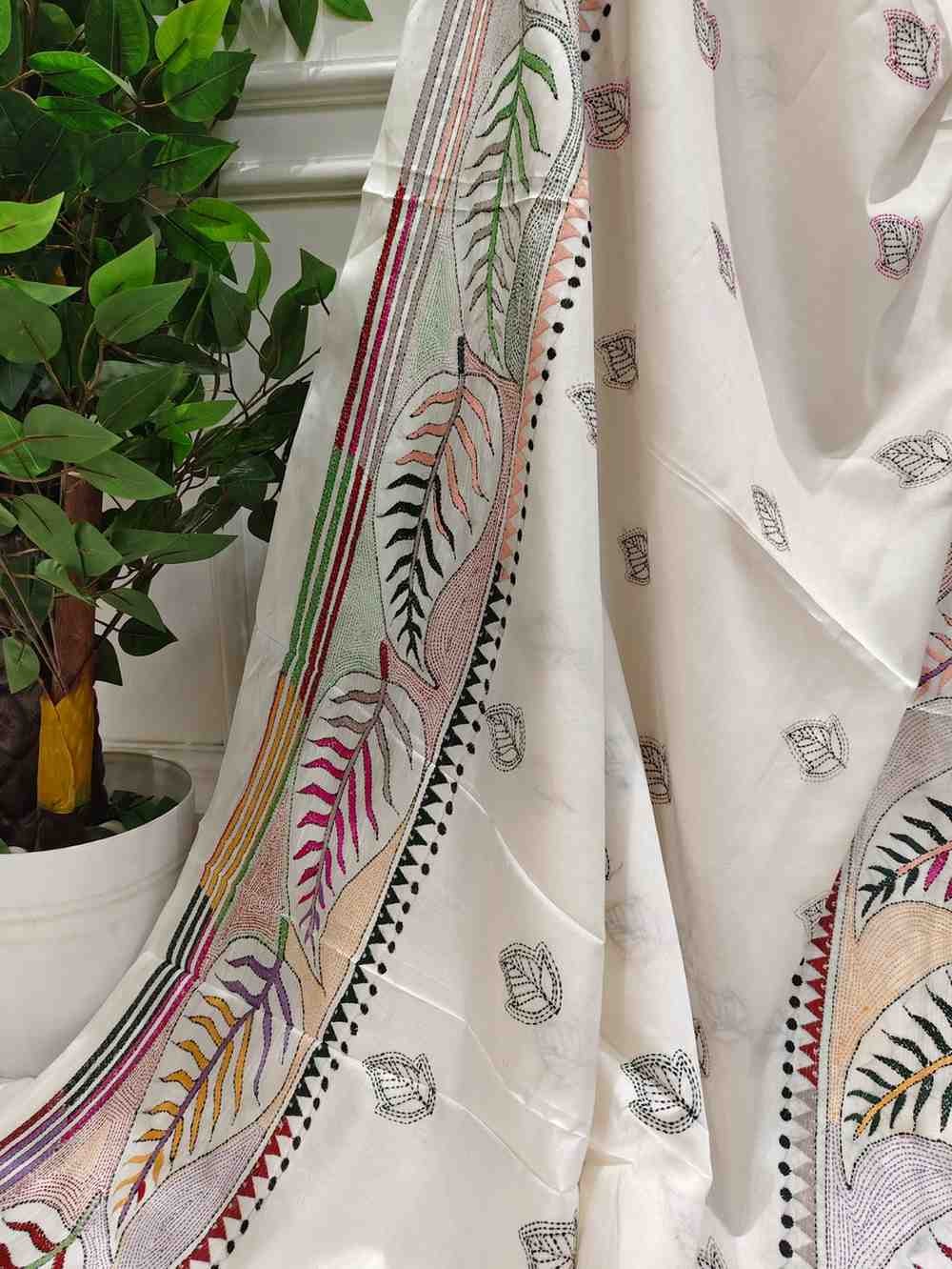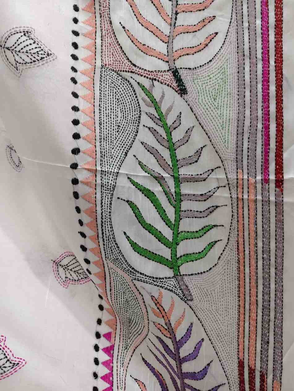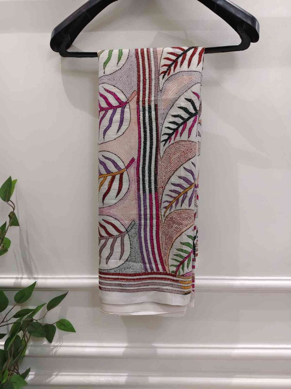 Serene White Leaf Touch Bangalore Silk Kantha Saree