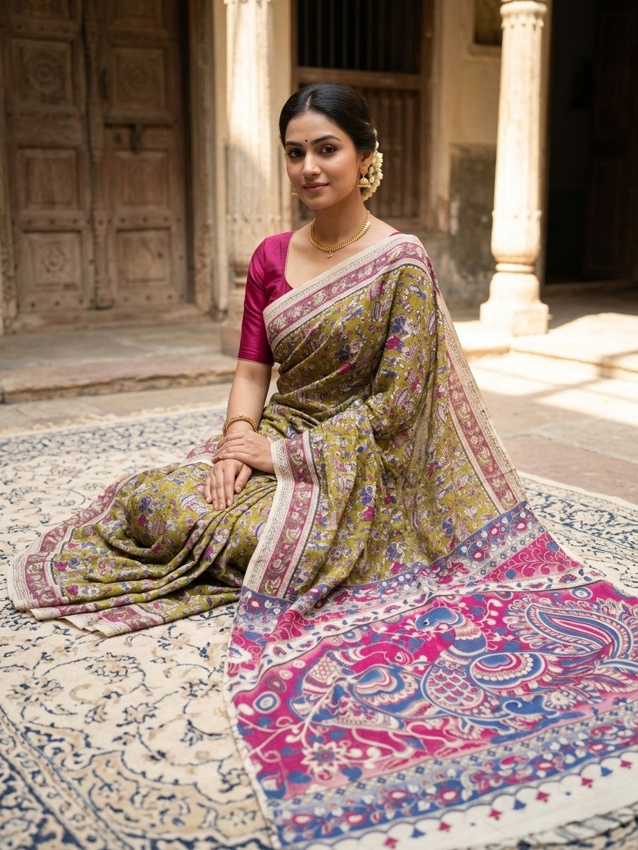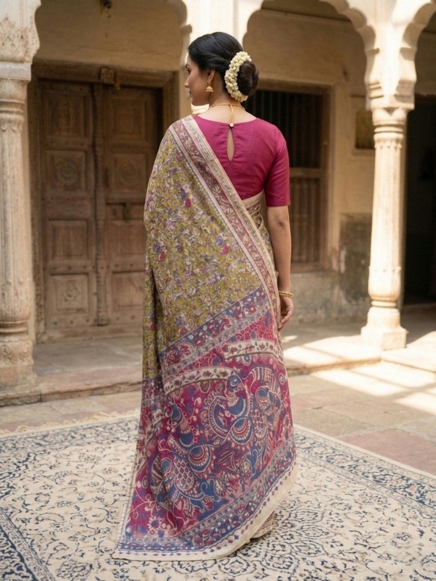 • Kalamkari sarees are sun-dried in open agricultural fields, which may result in minor dust marks — a testament to their authenticity. We recommend washing before first use.