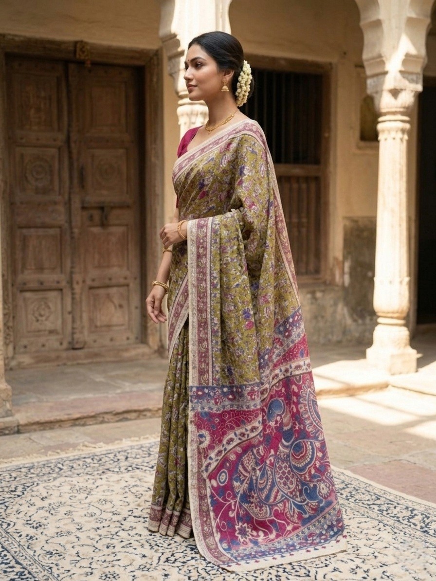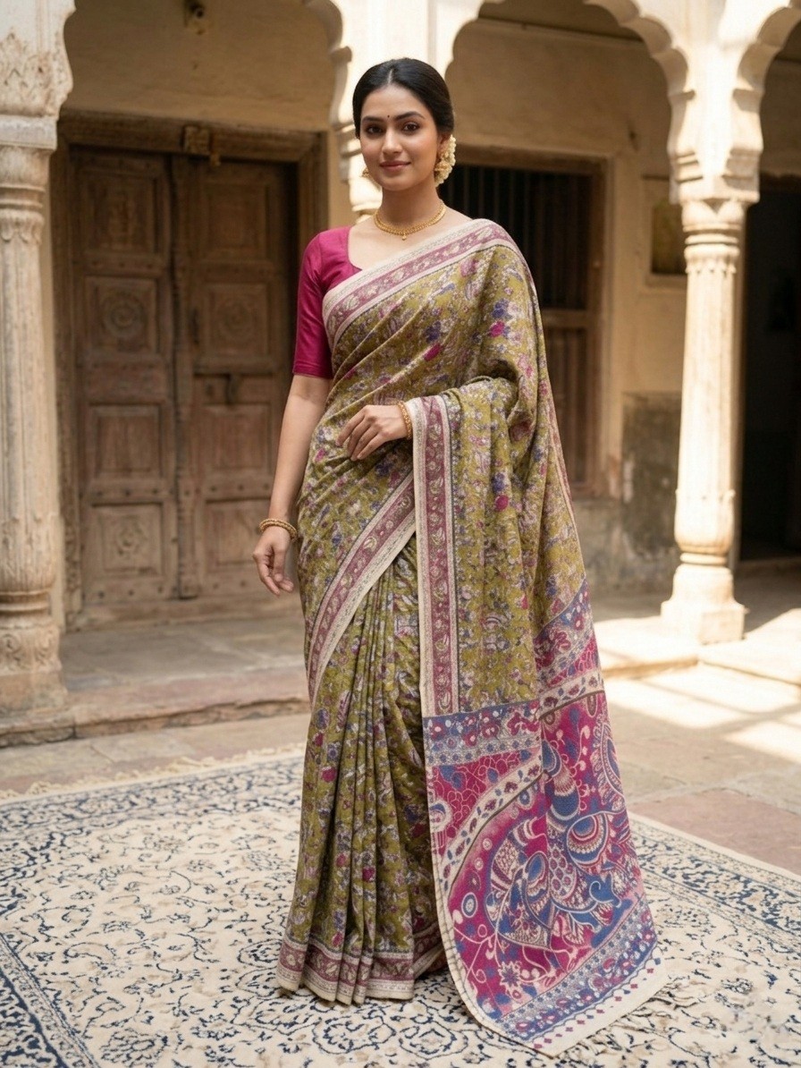 Narikatika Olive Green Nellore Silk Kalamkari Saree
