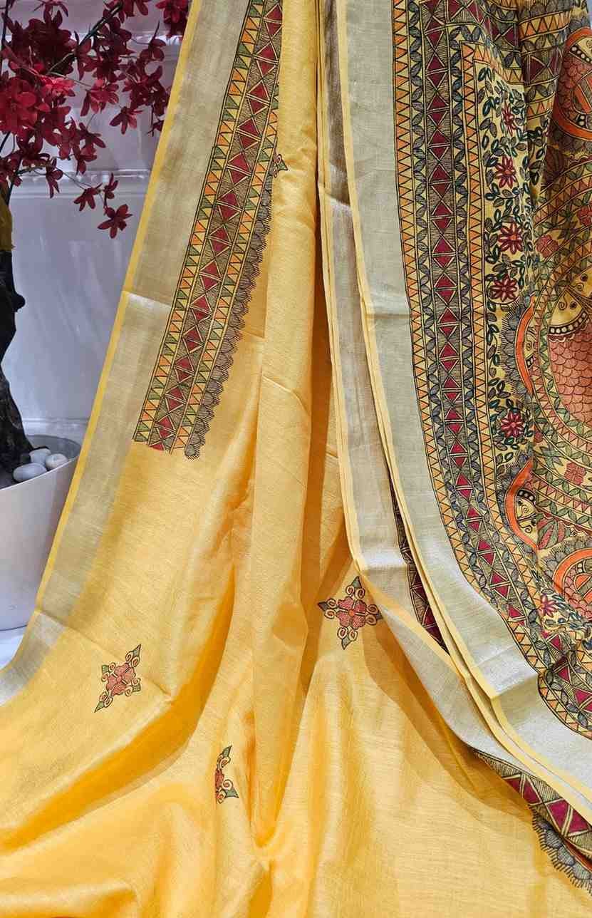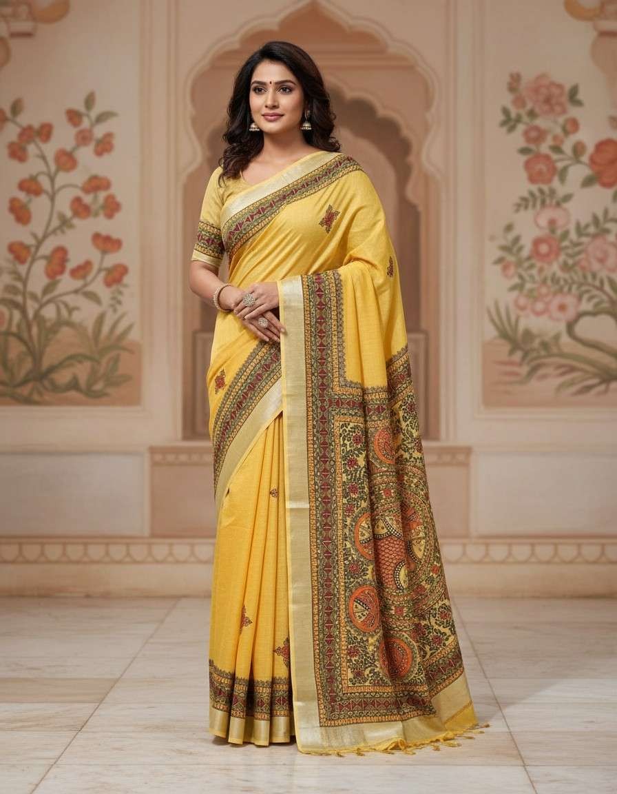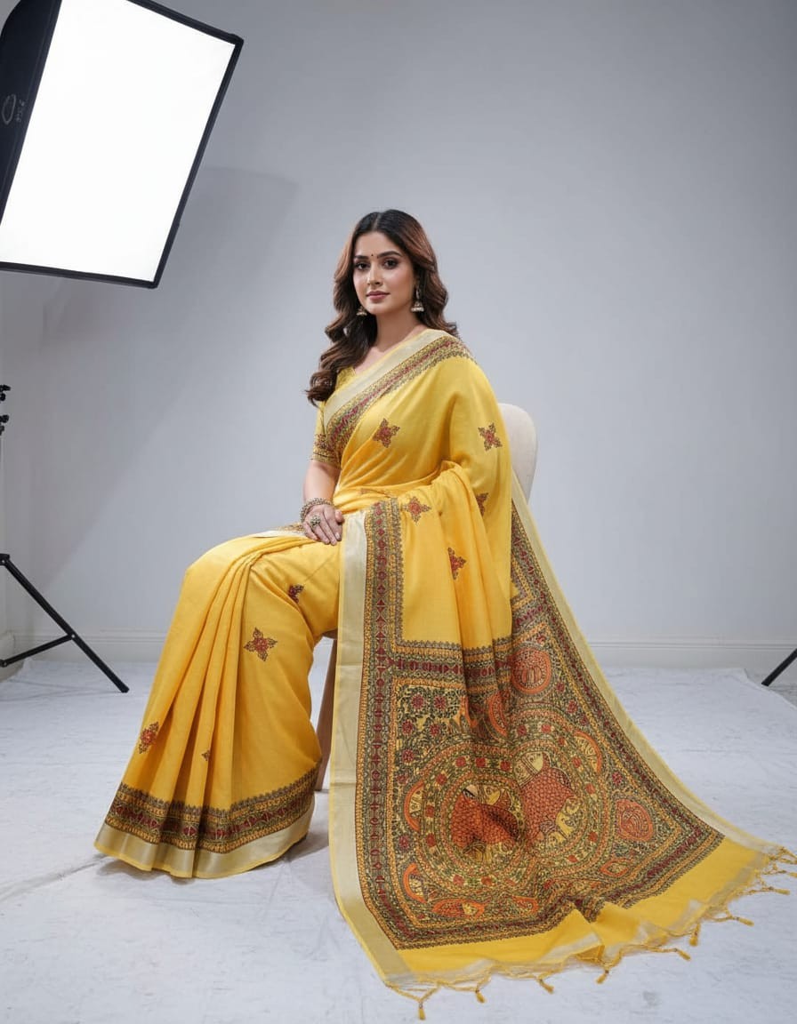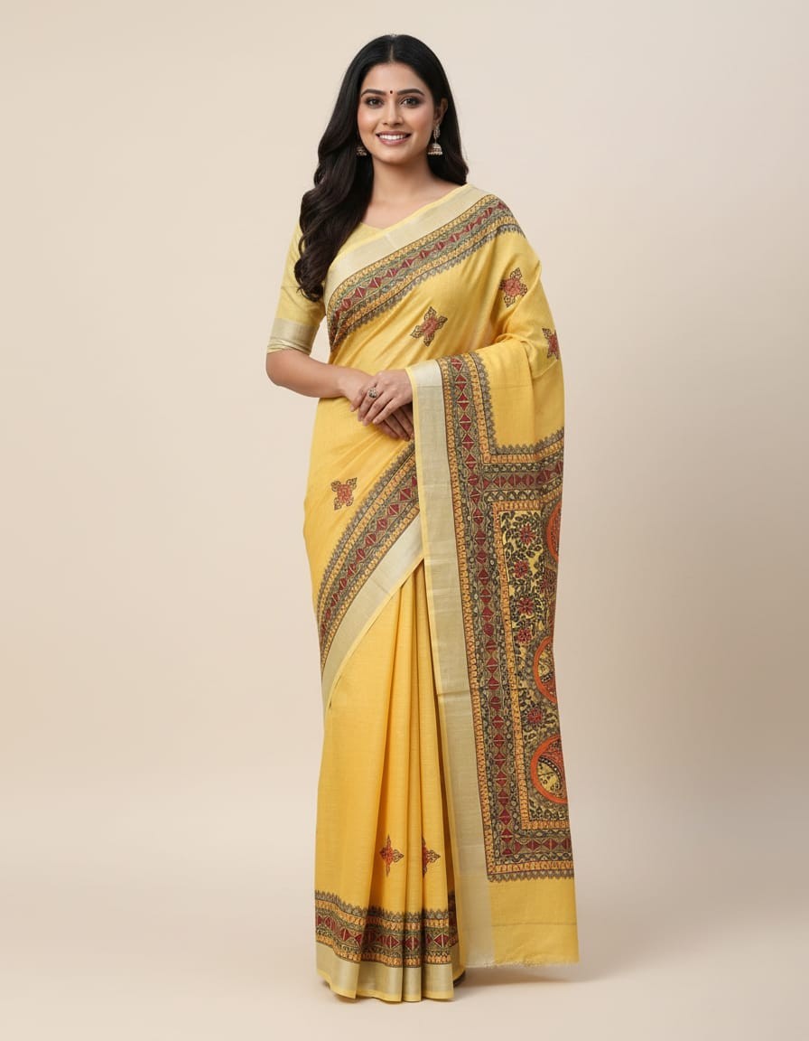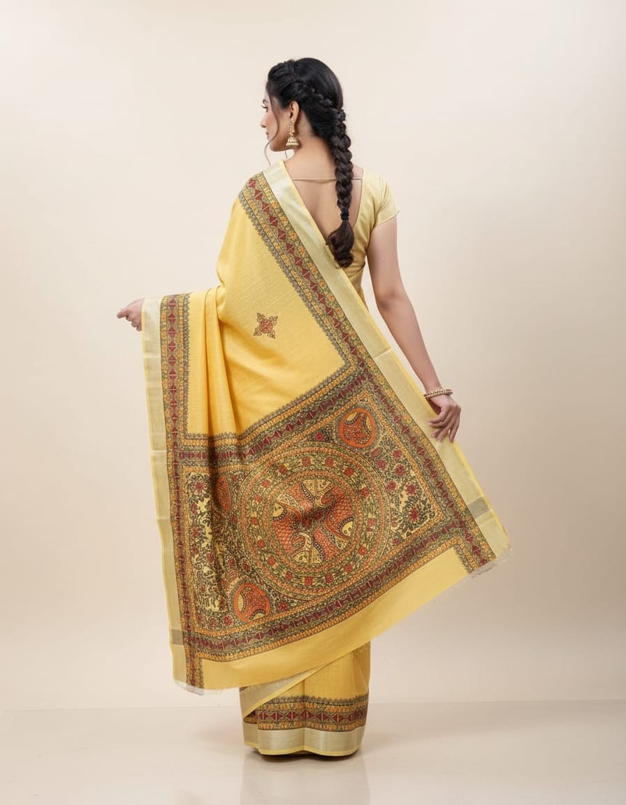 Dive into tradition with the Swarna Matsya Hand painted Madhubani Blend Saree, a mesmerizing piece inspired by ancient folklore and the wisdom of water. Adorned with intricate hand-painted fish (Matsya) motifs, this saree reflects prosperity, fertility, and spiritual abundance — all central themes in Madhubani art from Bihar. The soft, premium fabric blend offers a graceful drape, while the golden hues add a subtle touch of luxury. A perfect ensemble for cultural gatherings, festive occasions, or artistic celebrations.