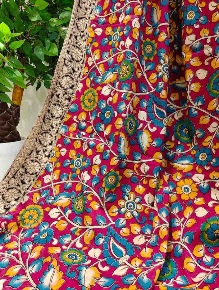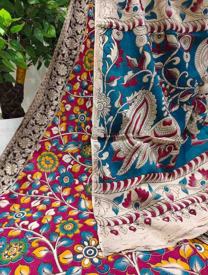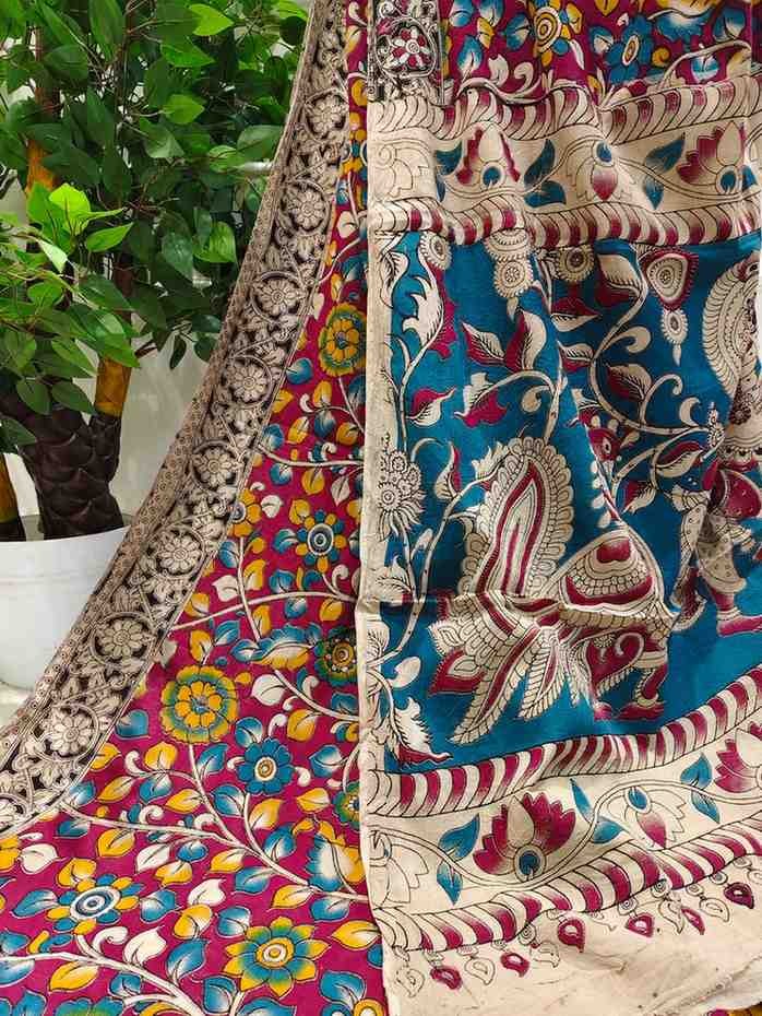 • Kalamkari sarees are sun-dried in open agricultural fields, which may result in minor dust marks — a testament to their authenticity. We recommend washing before first use.