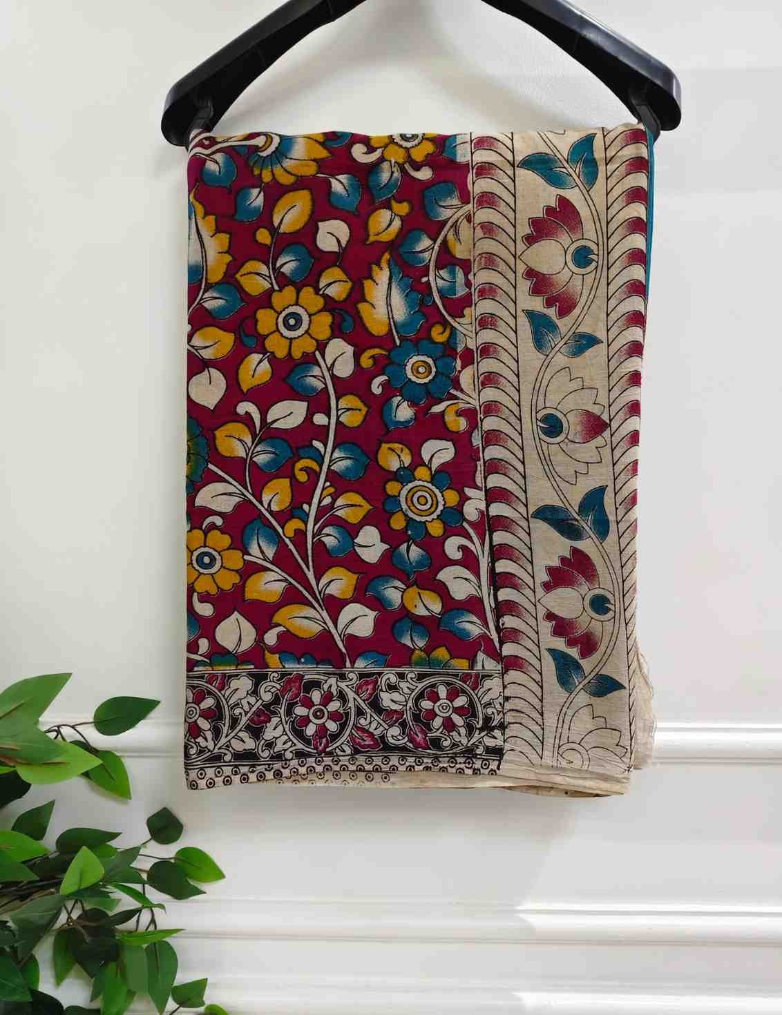 'Tamarparni' Crimson Red canvas with Floral design cotton Kalamkari Saree