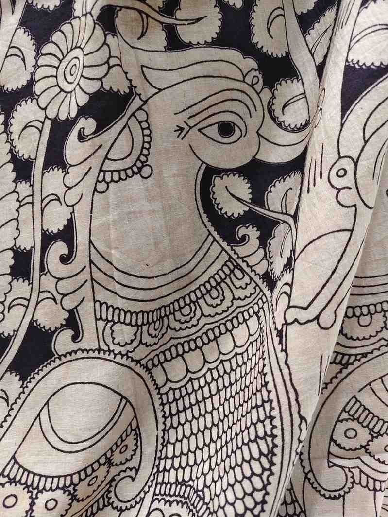 'Tamravallika' off White canvas with Black design cotton Kalamkari Saree