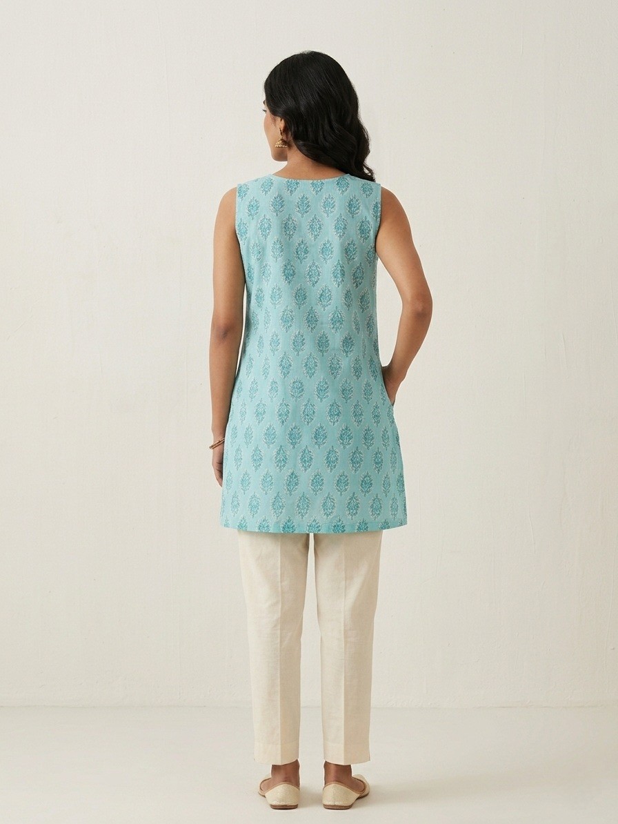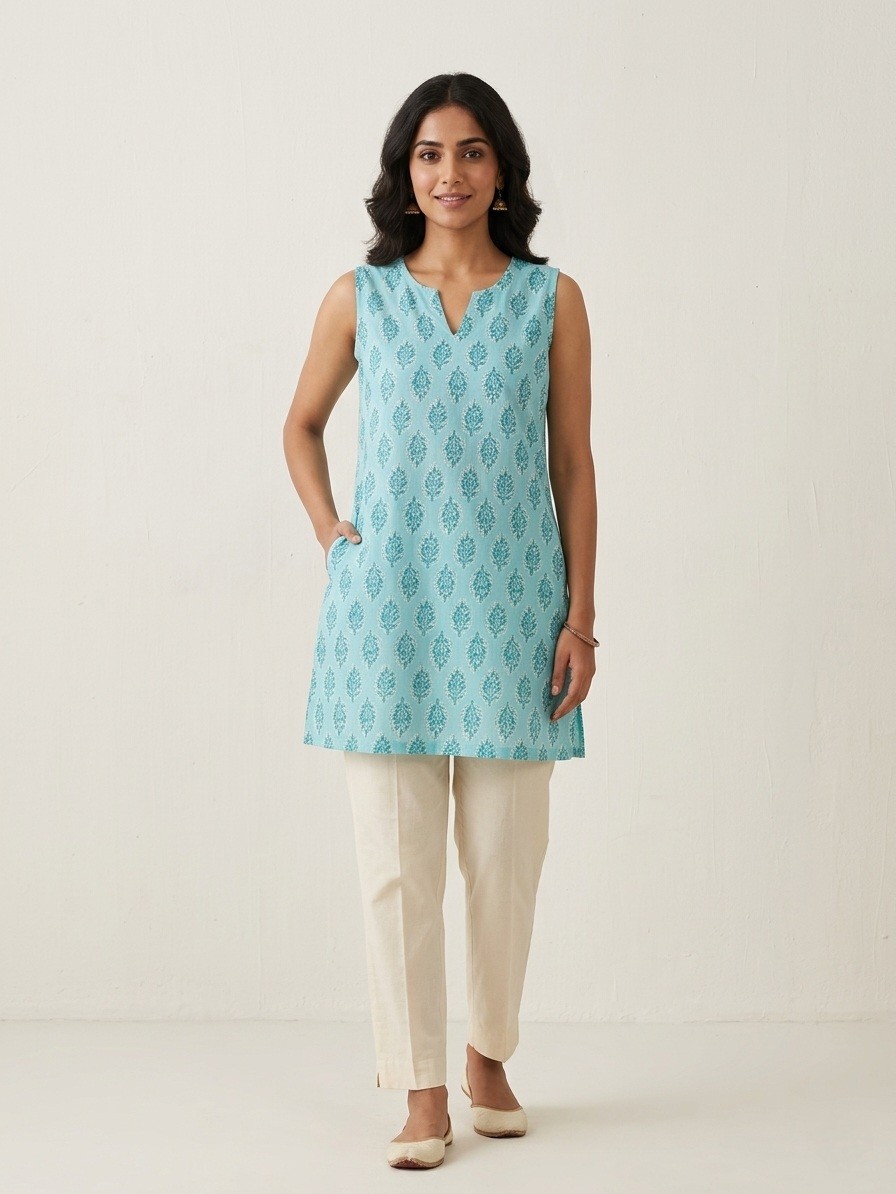 This is a sleeveless, short cotton kurti designed with a contemporary ethnic look.