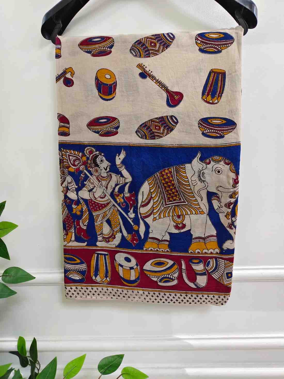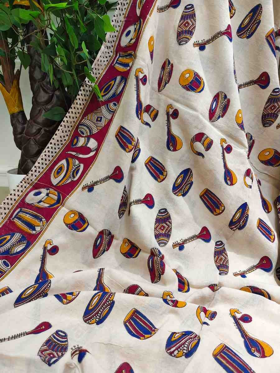 'Vadyarasa' White base with Musical instrument motifs cotton Kalamkari Saree