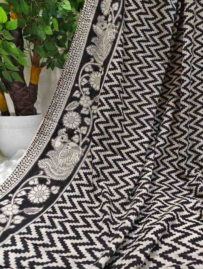 'Vakrarekha' Black canvas cotton Kalamkari Saree