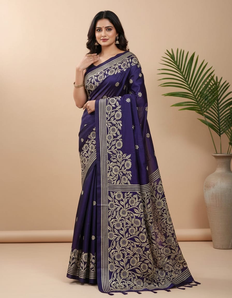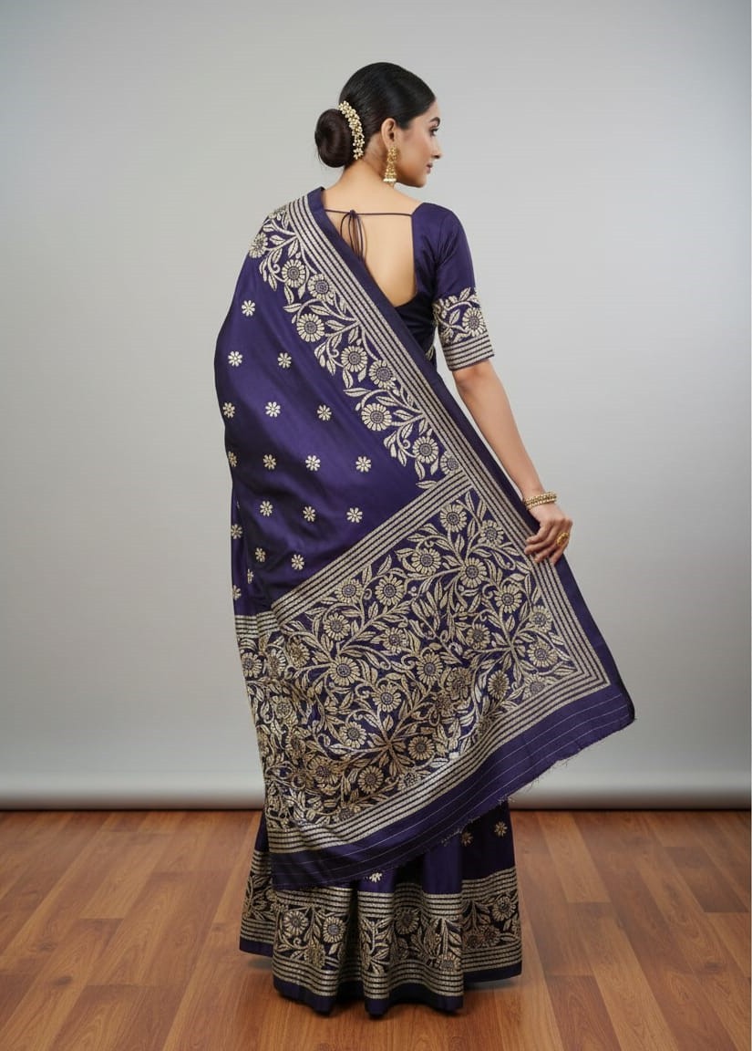 Celebrate timeless craftsmanship with this exquisite Kantha saree, a traditional form of folk embroidery from West Bengal, India. Each saree is a piece of wearable art, hand-stitched using a running stitch technique that has been passed down for generations.