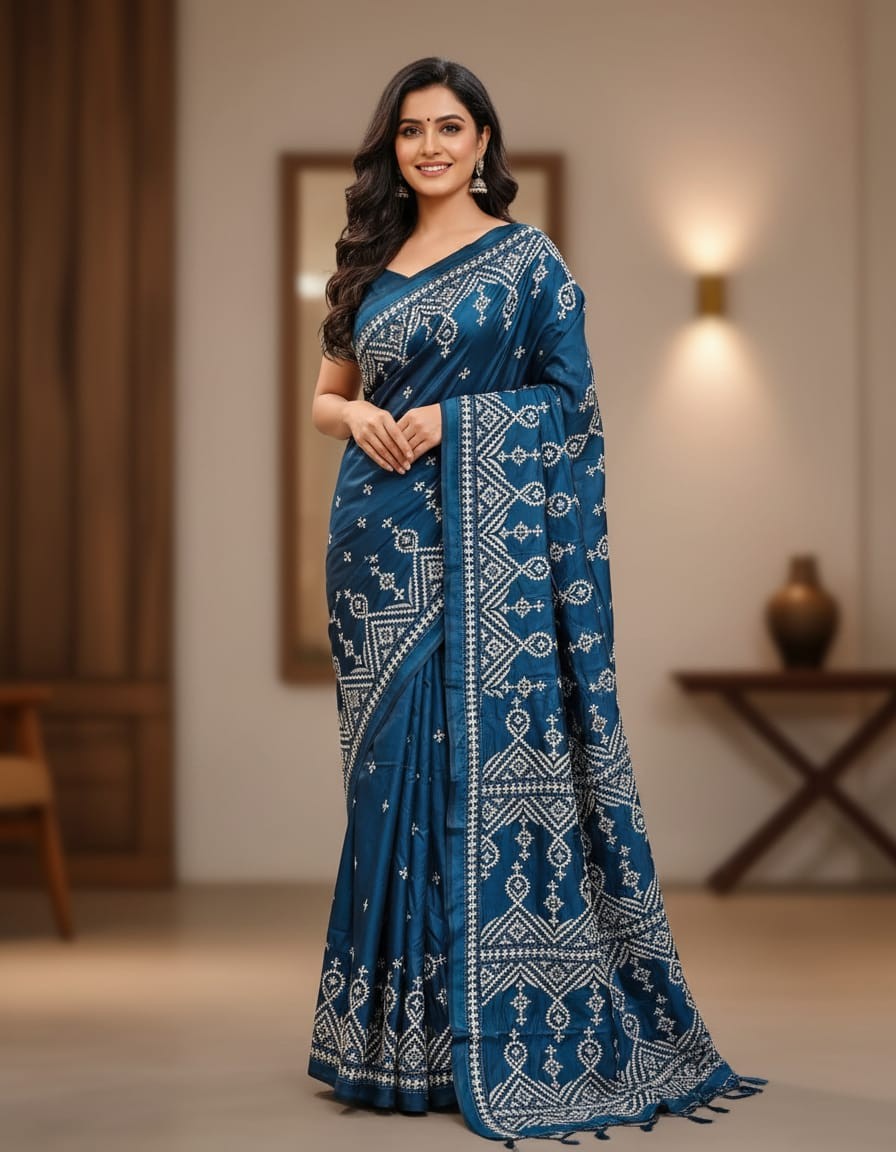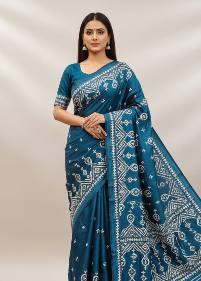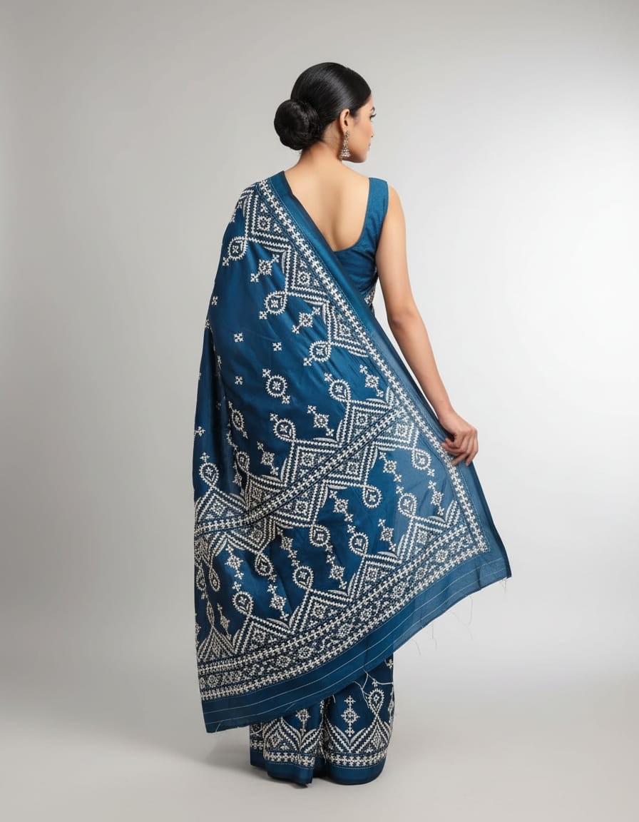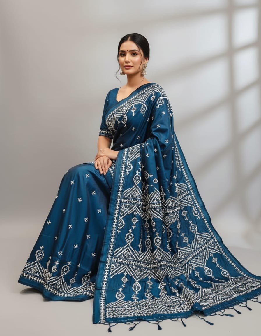 Celebrate timeless craftsmanship with this exquisite Kantha saree, a traditional form of folk embroidery from West Bengal, India. Each saree is a piece of wearable art, hand-stitched using a running stitch technique that has been passed down for generations.
