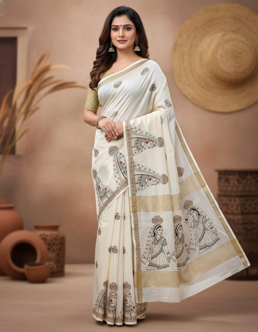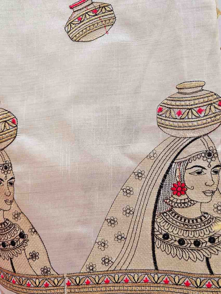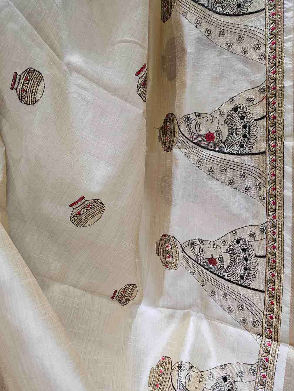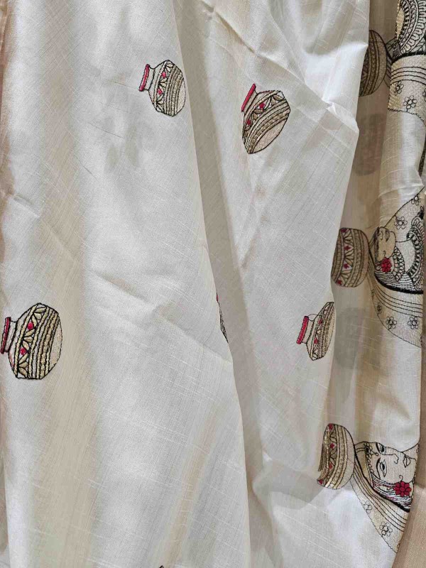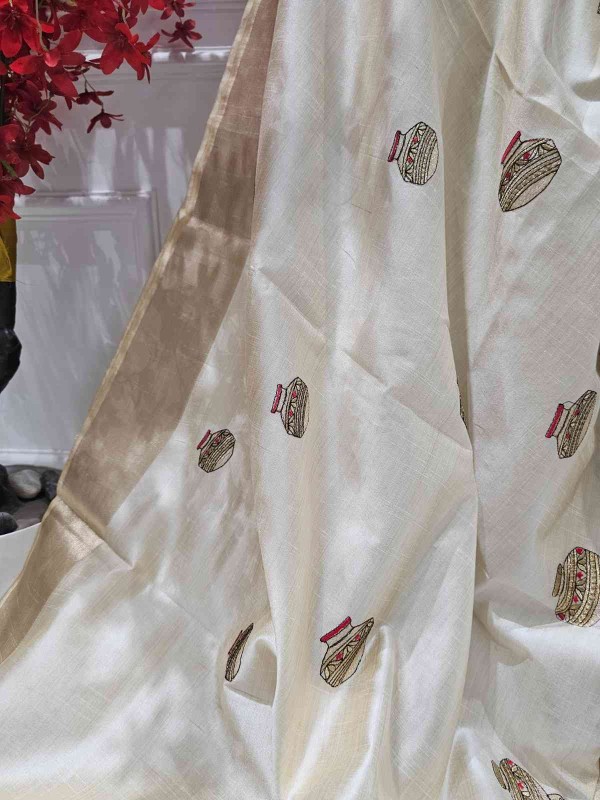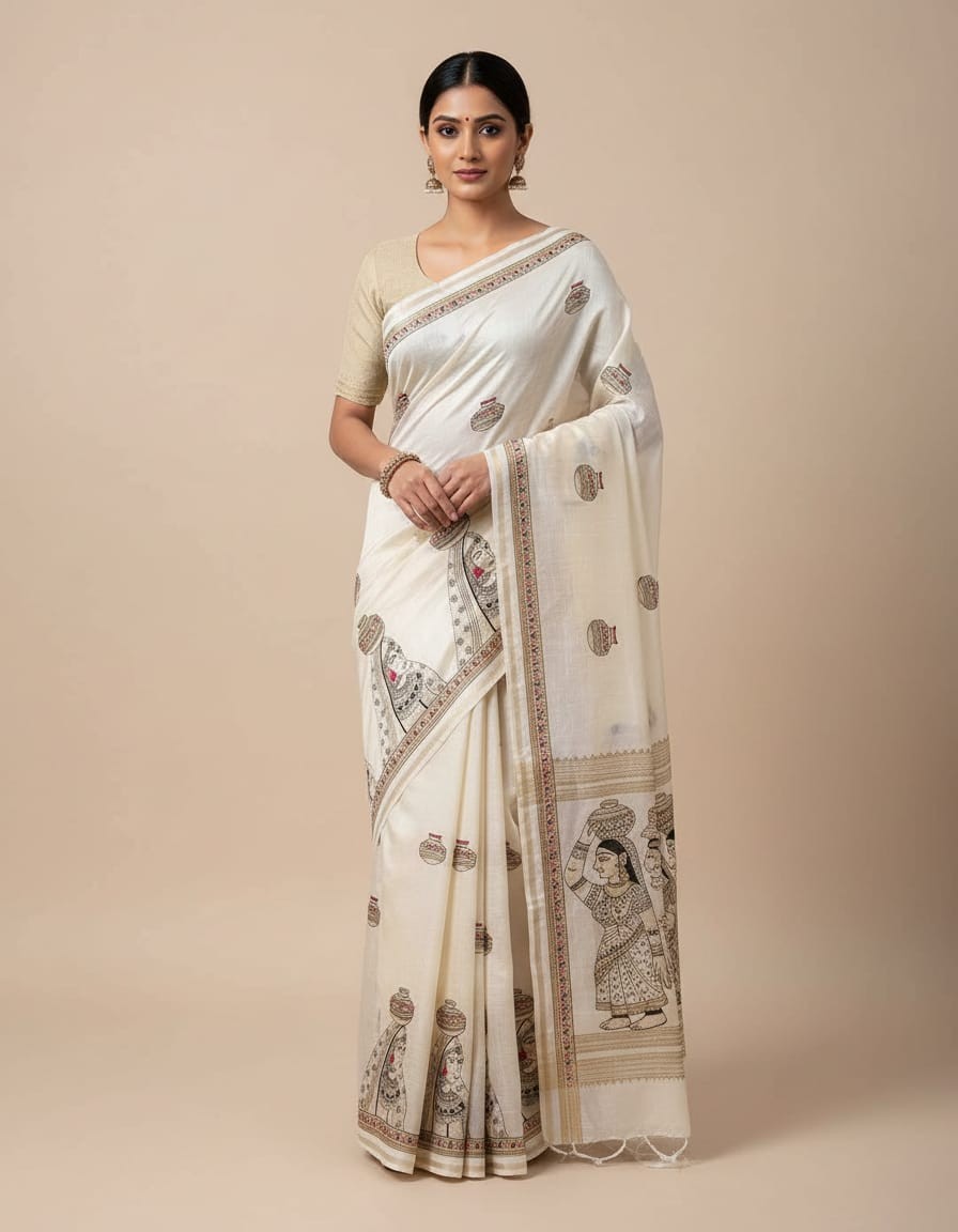 Inspired by the graceful rhythms of rural life, the Women Carrying Pot Motif Semi Tussar Saree beautifully captures the essence of tradition and resilience. Woven from breathable semi tussar silk, this saree features delicate, hand-drawn motifs of women carrying pots, a symbol of daily life, community, and feminine strength. The soft texture of the fabric enhances the artistic detailing, creating an elegant drape that tells a story of heritage with every fold. A perfect piece for cultural functions, art events, or meaningful celebrations.